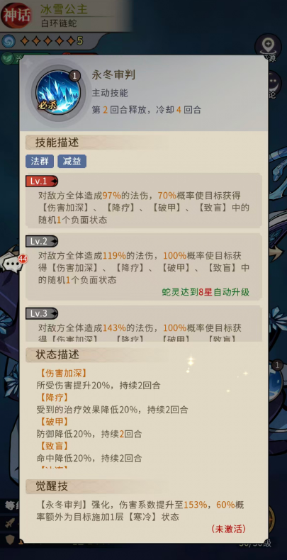 必杀技【永冬审判】则承担主力控场职能:首段造成敌方全体97%法术伤害,并有70%概率施加【伤害加深】(提升受击伤害20%);若触发成功,则追加第二段143%法伤,并100%附加【伤害加深】,同时从【降疗】(降低目标所受治疗效果20%)、【破甲】(削减防御20%)、【致盲】(降低命中20%)、【冰冻】(强制跳过行动,持续至承受2次攻击后解除,每回合仅生效1次)、【沉默】(禁用主动技能)中随机施加1种负面状态。此外,该技能还拥有40%概率额外叠加1层【寒冷】——每层降低防御4%、速度5%,最多可叠加5层,所有负面效果持续2回合(冰冻除外)。觉醒后,伤害提升至153%,【寒冷】附加概率提高至60%。