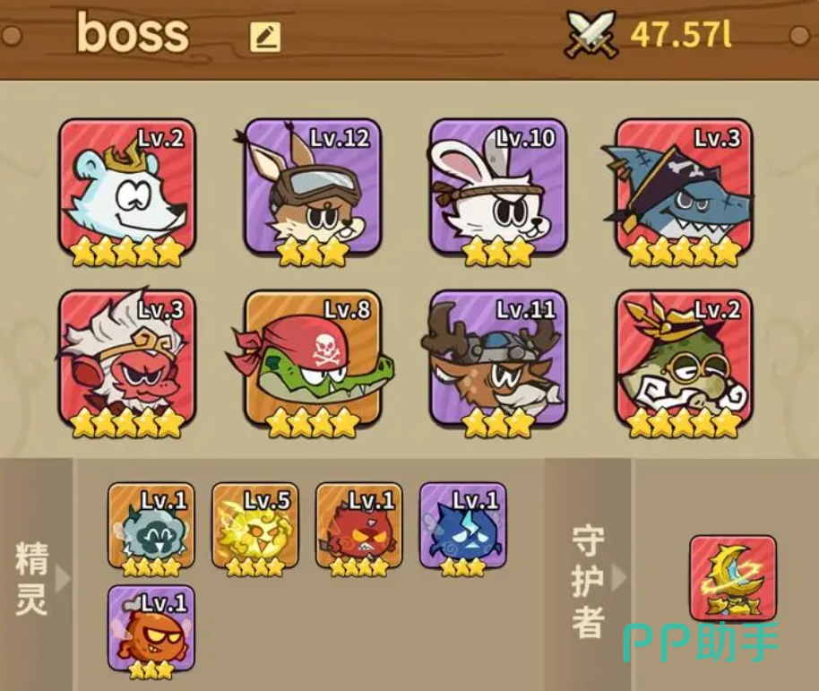 爆发流阵容适用于多数单体高血量BOSS场景,核心逻辑在于压缩战斗时长以规避机制惩罚。该体系以鲨鱼为绝对主C,其被动可随攻击次数提升箭矢等级,持续输出下限稳定;粉红豹、老虎、熊、猴子、死神、鳄鱼构成辅助矩阵,其中猴子提供关键增益覆盖率,死神强化暴击转化效率。精灵配置推荐风铃(提升攻速阈值)、海格力(延长增益持续时间)、坏坏(降低BOSS防御韧性),三者协同保障鲨鱼箭矢等级快速叠满并维持峰值输出窗口。