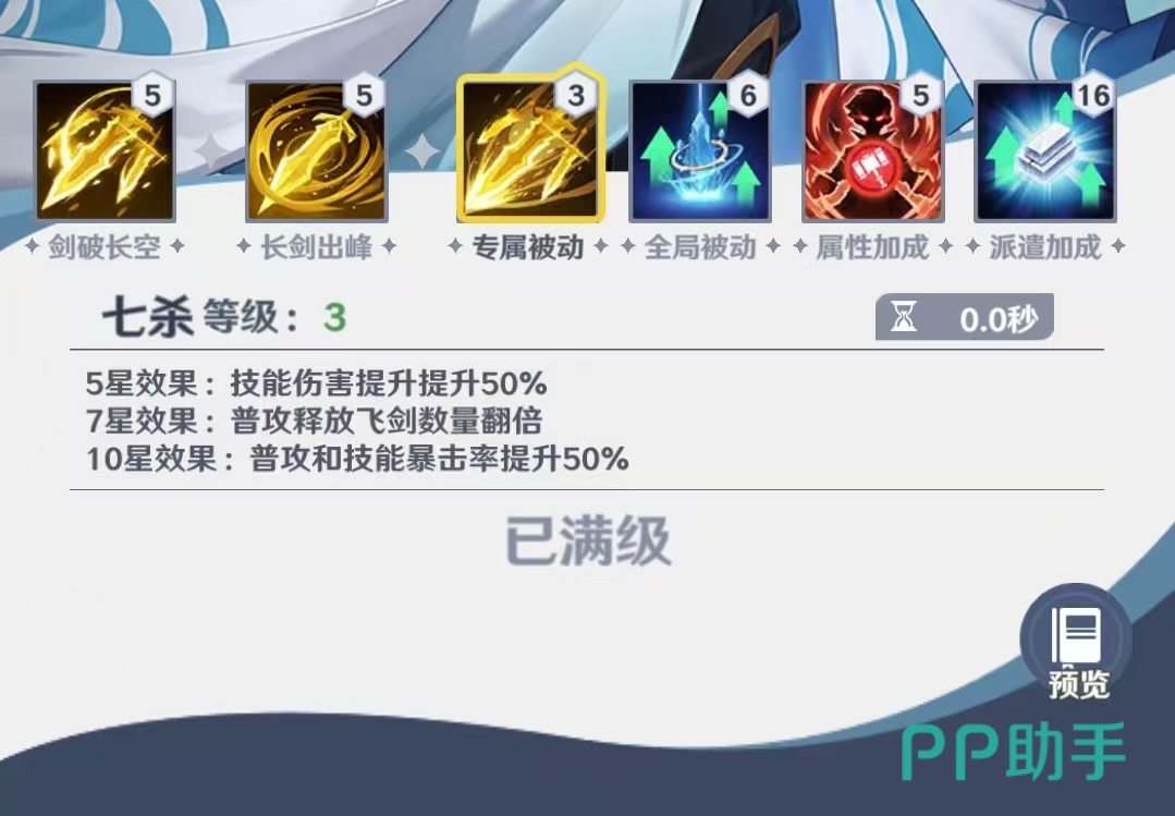 尘心专属被动【七杀】随星级提升呈现阶梯式强化:五星阶段提升全部技能伤害50%;七星阶段实现普攻飞剑数量翻倍,同步放大总伤与暴击触发概率;升至十星后,普攻与技能暴击率额外提升50%,使实战暴击覆盖率趋近满值,形成持续高压输出节奏。全局被动【剑道无双】赋予团队增益效果——当尘心参与主线推图时,全队魂师造成的伤害提升18%;同时在铁匠铺派遣场景中可激活额外资源产出加成,进一步优化养成效率。