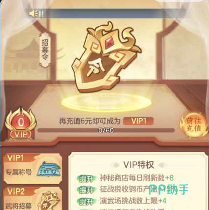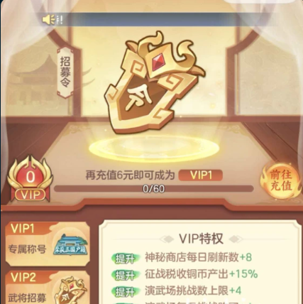 完成6元首充不仅解锁双倍元宝,还可激活限定招募卡池,大幅提升获取人气武将赵云的概率。同时,该笔充值直接晋升至VIP1等级,并授予“夜三国户籍”专属称号。随着VIP等级提升,后续还将开放高级武将定向招募权限、个性化头像框及神秘商店每日额外8次刷新机会,持续增强资源获取能力与养成自由度。