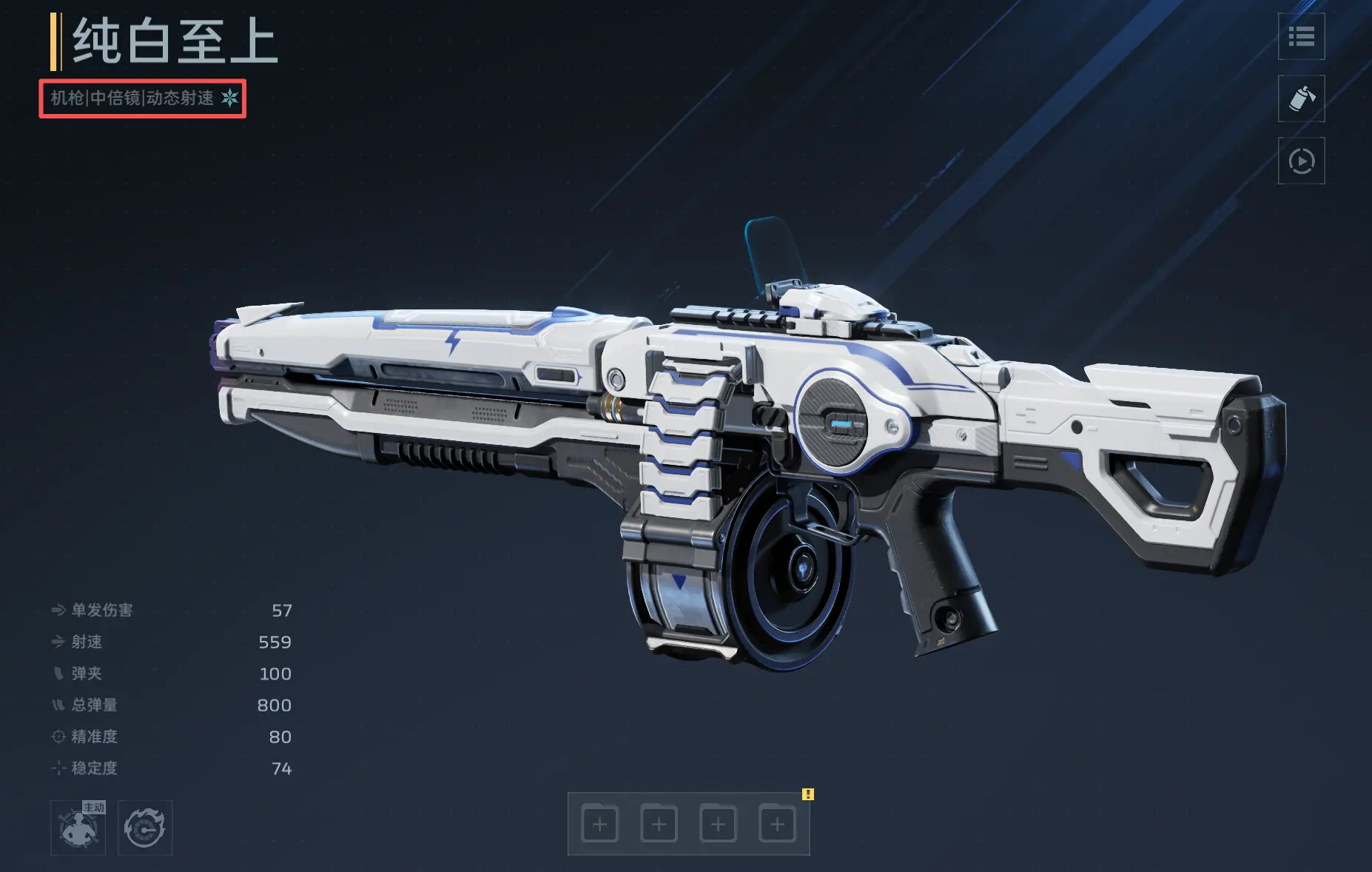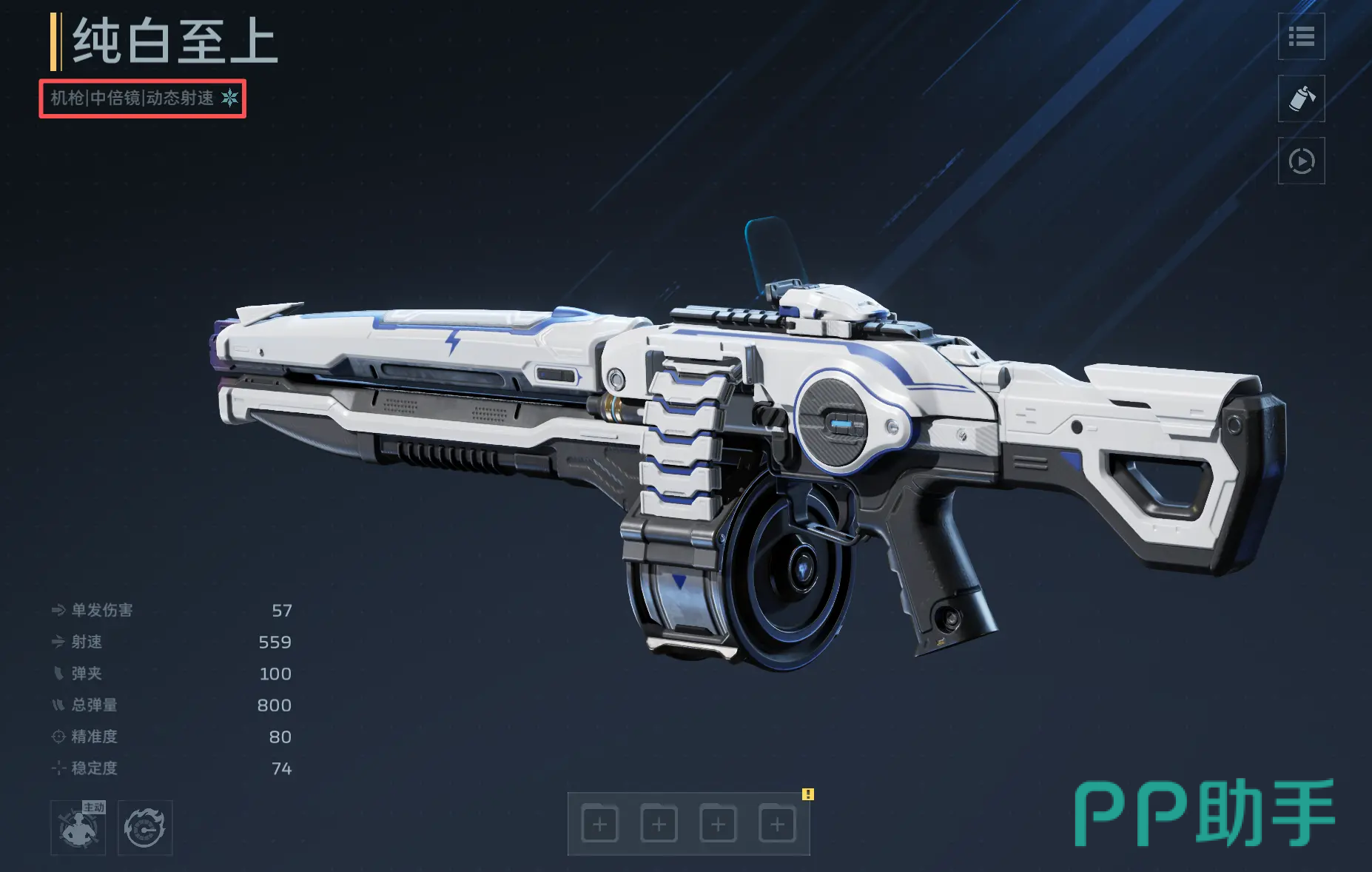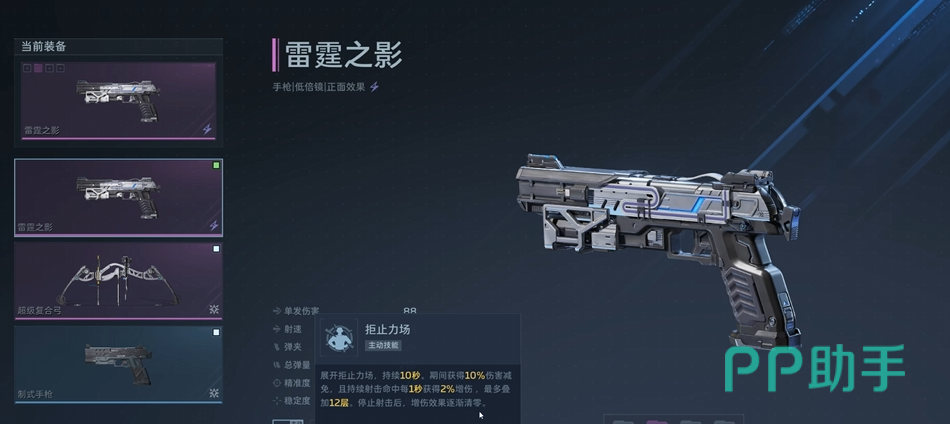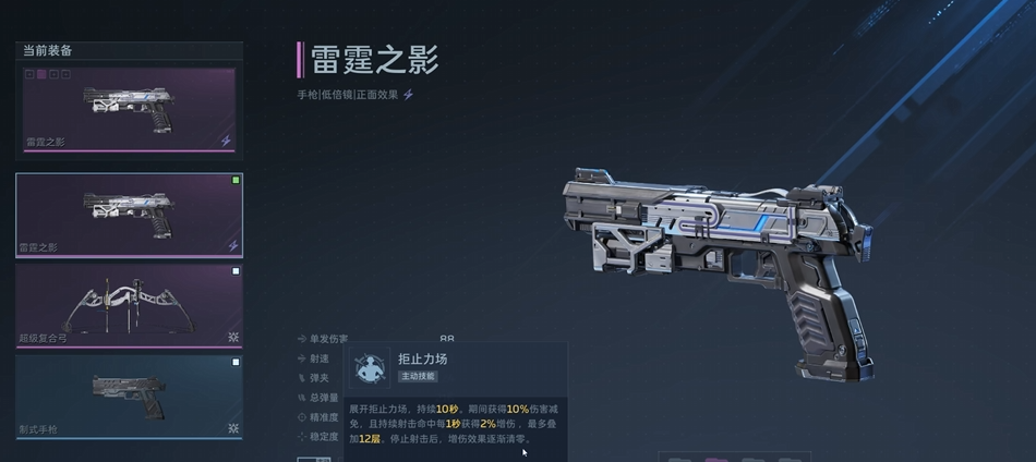 首推主武器为“纯白至上”。该枪械在游戏前期具备显著优势,建议优先培养。其被动技能“强力冲击”可在持续射击过程中逐步提升射速,最高增幅达100%,显著强化中近距离压制能力。