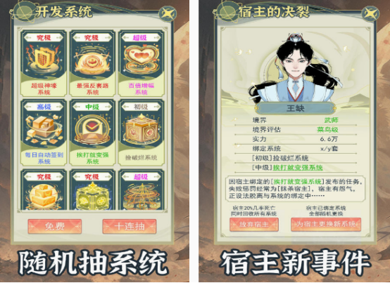 在这款玩法比较简单要休闲的穿越游戏中,你将成为穿越者,至于进入的世界观以及精美的剧情是怎样的,都与玩家自己的选择有很大的关系,属于自由度比较高的玩法。无论是挑系统还是定主角等都由你来决定,在寻找宿主这一个系统当中,你将会进入各种宇宙世界,还有随机抽系统,会经历每个宿主的各种新事件。