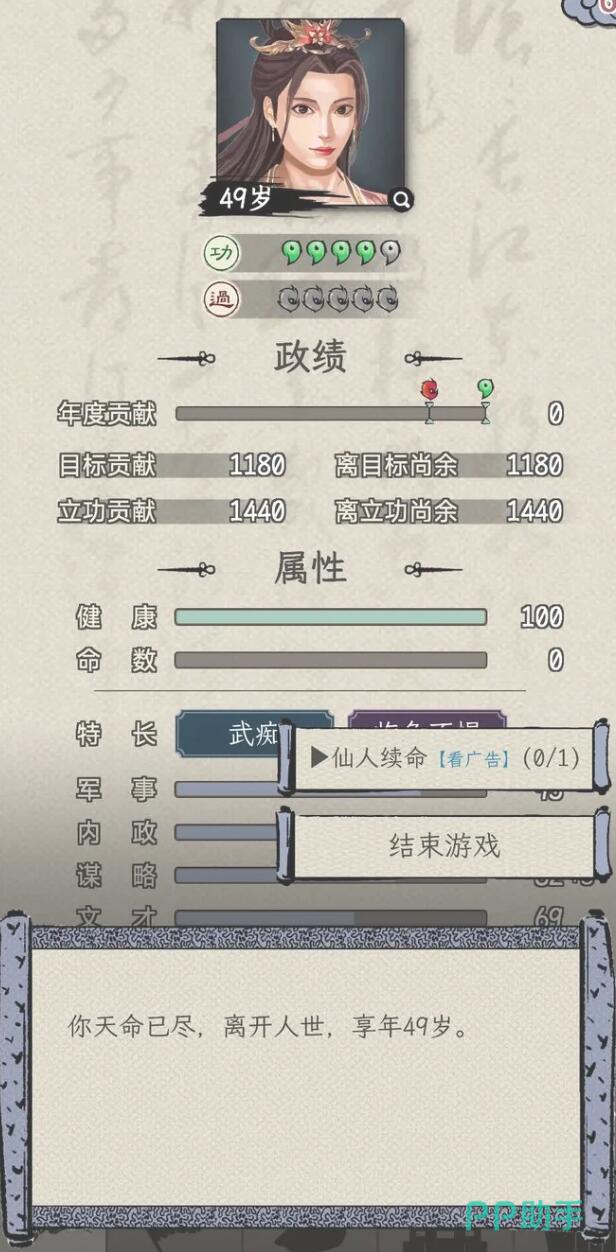 命数是三国人生模拟中决定角色存活周期的核心数值,直接影响寿命长度与随机事件触发概率。今天小编为大家分享一下三国人生模拟命数怎么增加。该数值通常稳定,但遭遇算命、服药等事件时会下降,需通过特定NPC服务维持或提升。合理管理命数可延长角色生存时间,为我们一统江山提供更多机会。
