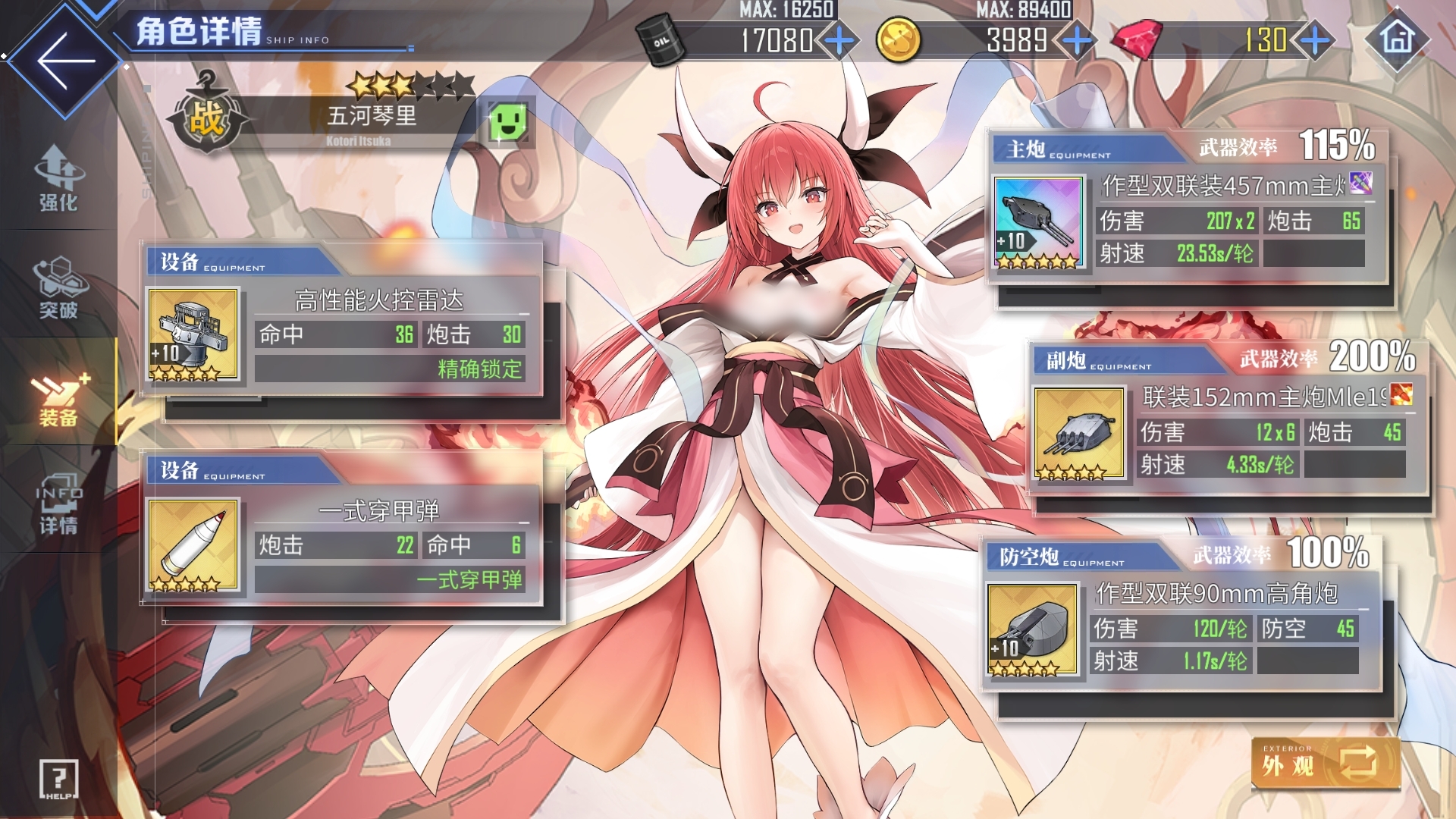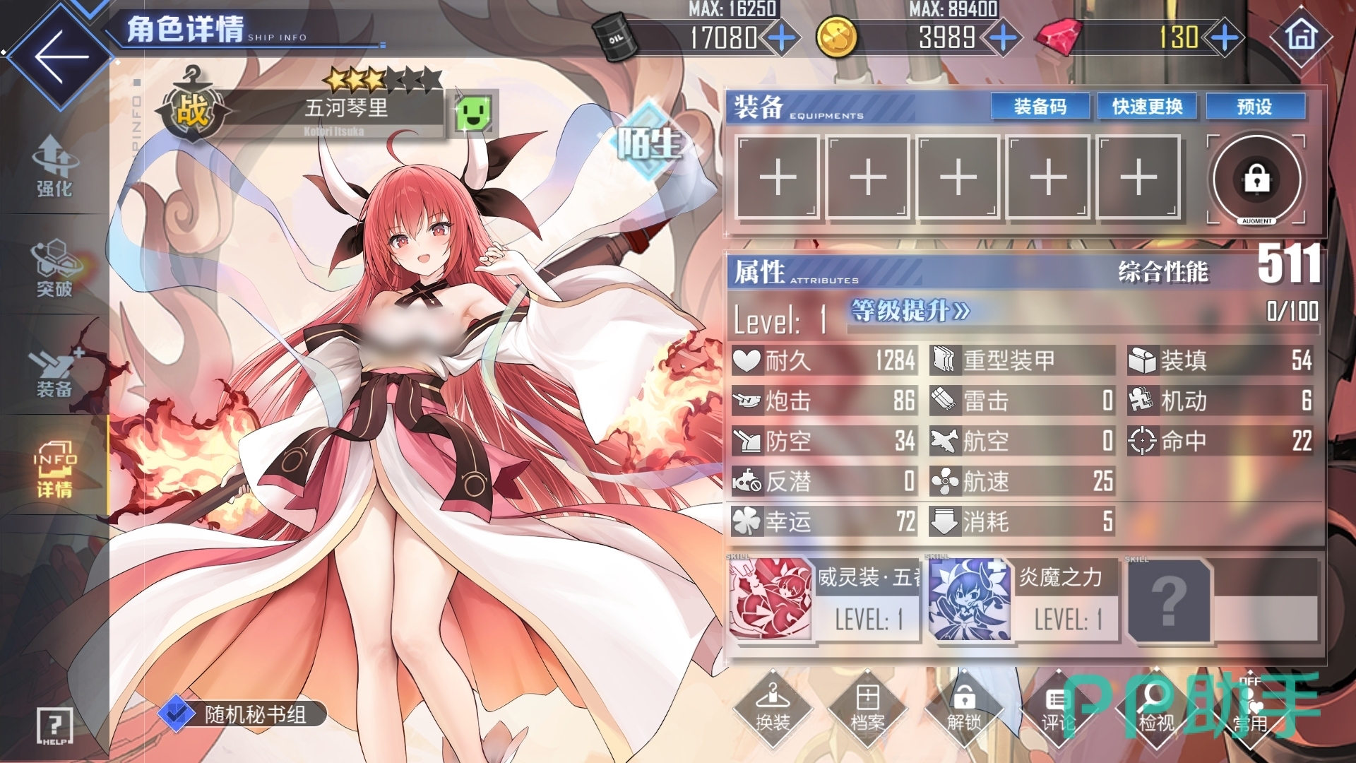 她的另一项关键技能名为炎魔之力,在未装备专属兵装时即可生效:可减少自身受到的点燃类伤害,并在遭遇致命伤害时规避该次攻击,同时进入持续10秒的无敌状态,此效果每场战斗仅触发一次。此外,当敌方单位进入其防御范围时,还能获得减伤增益。这使得五河琴里在前线承伤时具备较强的抗压能力。若装配专属兵装“灼烂歼鬼”,该技能将进一步强化——不仅提升炮击属性与防空性能,且在触发回避后还可恢复一定耐久值,显著增强续航。