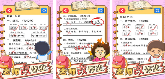 作为老师的你,将要在这里完成批改作业的任务,这里涵盖的关卡内容特别丰富,每个关卡的难度也会完全不同。在关卡挑战时,玩家就会发现很多的汉字,而在这里有很多错别字,需要玩家仔细观察当。寻找到错别字之后,就需要直接点击屏幕就能圈出来。每个关卡中的错别字数量都完全不同,只要按照关卡的要求,将所有错别字全部找到就能顺利闯关。