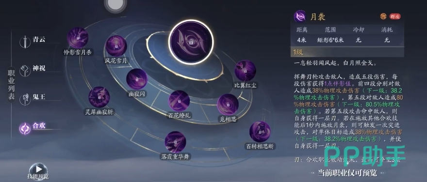 月袭作为合欢的基础位移手段,具备无冷却时间的优势,极大增强了角色的灵活性。每次施放可向前进行短距离瞬移并对路径敌人造成伤害,连续使用四次后,第五次将触发强化版本,不仅伤害提高,还会为角色叠加一层刃标记。这种可叠加的印记是后续技能增伤的重要条件,实战中可通过频繁穿插走位,在规避敌方控制的同时完成层数累积,为后续爆发做好准备。