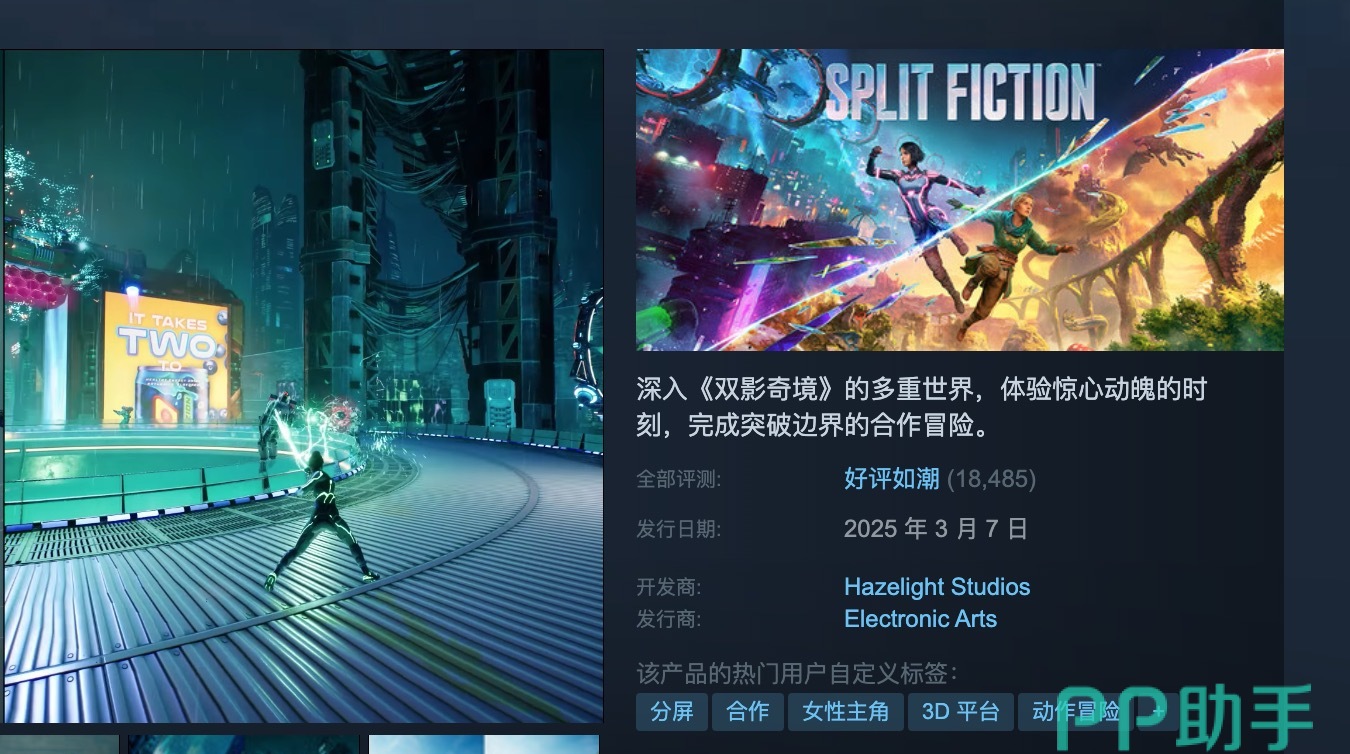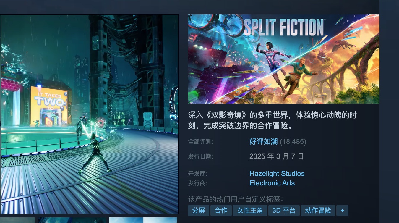 双影奇境在Steam上的英文名是 Split Fiction。这款游戏是由《双人成行》的开发商打造的全新力作,延续了前作的合作玩法精髓,同时加入了更多动作冒险元素。如果你在平台上搜索,无论是输入“双影奇境”还是英文名称,都能找到它。