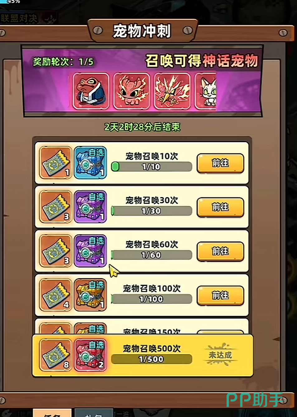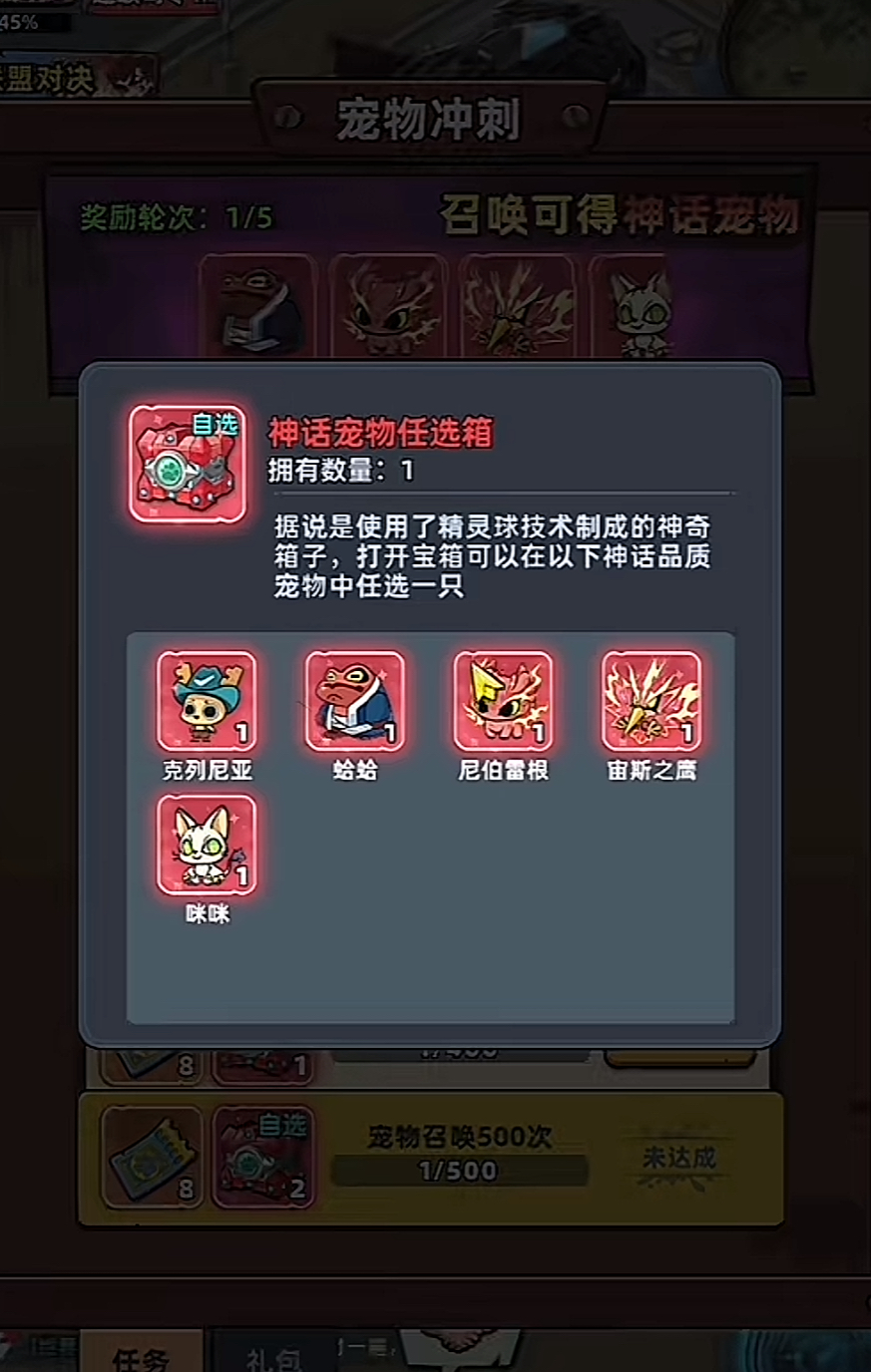 宠物冲刺活动自生存第14天起正式开启,全程划分为5个阶段任务节点。玩家需累计完成指定次数的宠物召唤(300次、400次、500次),即可领取对应轮次的宝箱奖励。最终档位奖励为“神话宠物任选箱”——当达成500次召唤条件时,可于5只神话宠物中任选2只;其余两档则限选1只。值得注意的是,300次门槛已可解锁基础神话选择权,对尚未完成图鉴收集的新手或资源受限玩家尤为友好。