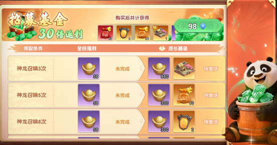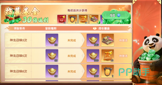 2.购买招募基金:获得10个UR碎片自选礼包招募神符、30个SSR+碎片自选礼包、聚贤堂建筑及大量元宝,加速高稀有度英雄组建进程