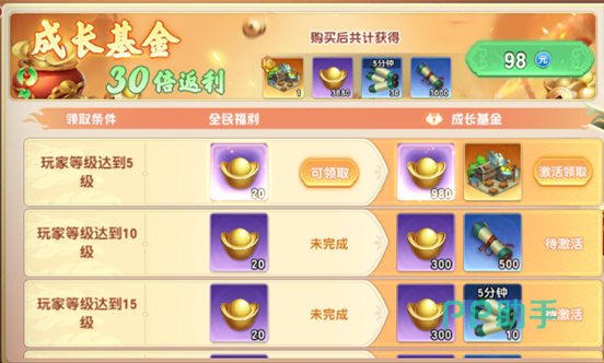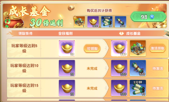 1.购买成长基金:一次性获取大量元宝、茶楼建筑、入门心法及经验书,助力英雄等级成长与闯关效率提升