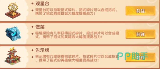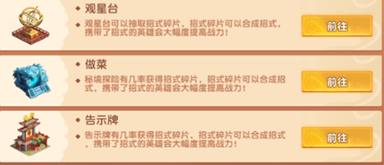 1.观星台:通过抽取获取招式碎片,集齐后合成完整招式,装配后大幅提升英雄输出能力
