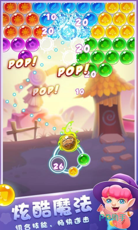《泡泡精灵传奇》是一跨休闲类型的消除游戏,当游戏开始过后屏幕上方将会出现非常多的五颜六色的泡泡,它们会随着时间的推移不断地向下对玩家进行压迫,小伙伴们唯一能够做的就是使用手中的泡泡大炮来对上方的泡泡进行射击,玩家每次只能发出一颗带有颜色的泡泡,三个颜色相同的泡泡会产生爆炸效果,只有消除了全部的泡泡玩家才能生存下来。