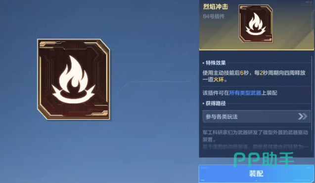 除了基础属性外,玩家还可以通过装配插件来强化武器性能。推荐首选“烈焰冲击”插件,装备后角色可向前方发射火环攻击,造成范围伤害,且该插件兼容所有武器类型,能有效增强整体输出能力。另一个值得推荐的是“钝化充能”,此插件在命中敌人时可降低其移动速度,同时为使用者回复5%的能量值。由于控制效果明显且适用性广,特别适合操作经验不足的玩家用来限制对手行动,从而提升命中效率。