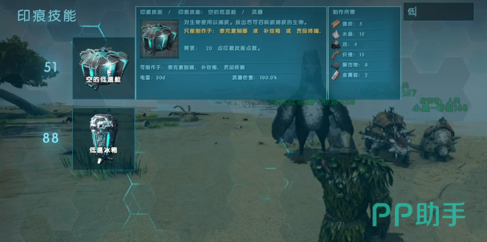 低温舱所需材料清单如下:兽皮×20、水晶×15、油×25、纤维×20、聚合物×10、金属锭×15。其中,兽皮与纤维属基础资源,击杀渡渡鸟、收割浆果丛即可稳定获取;金属锭可通过熔炉冶炼铁矿石获得;而油、水晶及聚合物则集中分布于地图北部雪山区域。该区域气候严寒,未配备保暖装备(如毛皮衣、火把或保温药剂)贸然进入极易触发冻伤减益,建议提前规划行装。
