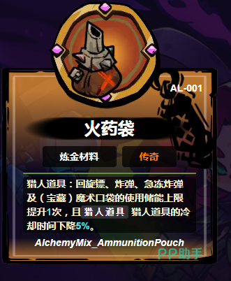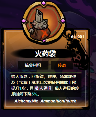 火药袋:由特制皮革包裹的秘制药粉,投入炼金台后可使所有炸弹类道具爆破半径增加0.5米;急冻炸弹冻结时长额外延长1秒;同时解锁一次道具携带上限扩容,并使道具整体冷却缩减5%。该材料显著提升岩浆喷吐类精英怪的应对稳定性,强化连续控场与爆发衔接能力。