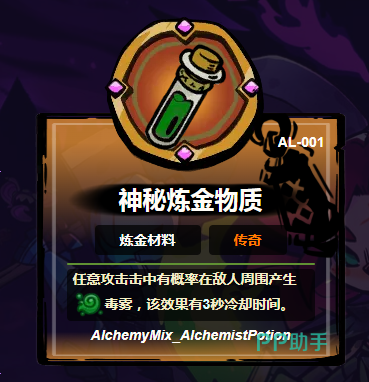 神秘炼金物质:瓶中悬浮的荧绿色液体具备精准的轨迹附着特性。释放后沿武器劈砍路径延伸,在命中点生成持续3秒的毒雾区域,同步激发地面裂隙中腐坏藤蔓的爆发式生长。该效果冷却时间为3秒,既保障群怪压制效率,又避免范围失控破坏战斗节奏平衡,是清理狭窄通道或包围阵型的高性价比选择。