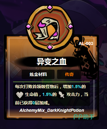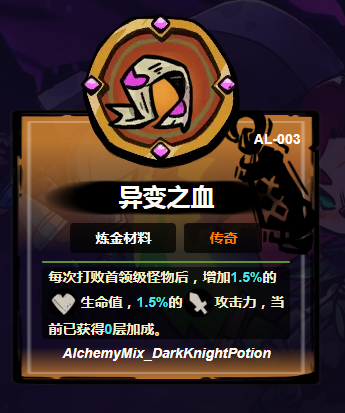 异变之血:盛装于活性容器内的蠕动血色物质,每次击败首领级敌人后自动叠加1层效果,每层提供1.5%攻击力与1.5%生命值加成。当层数累计至30层时,基础生命值突破2000点大关。该材料构建“以战养战”的成长闭环,使玩家在持续攻坚过程中实现属性与生存能力的同步跃升。