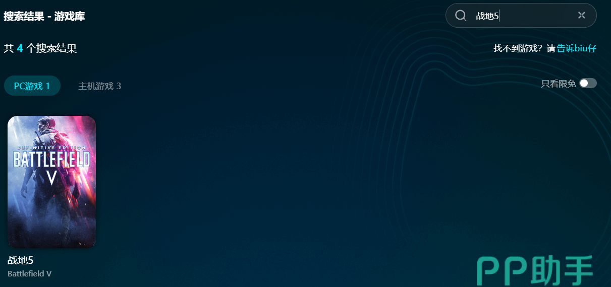 Biubiu支持自动化操作,玩家不需要手动配置,打开软件界面,在上方搜索框输入战地风云5,找到游戏,选择服务器直接加速。一键加速和停止加速的设计非常方便。