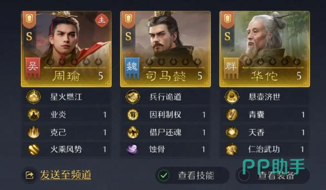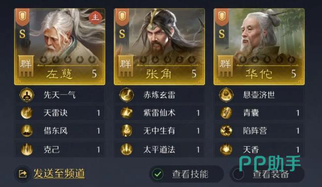在战法配置方面,华佗优先选择刮骨疗毒、资军后勤、天香等兼具治疗与减伤效果的技能,进一步强化其承伤缓冲能力;左慈与张角则推荐搭配雷暴、借东风、太平道法、克己等主动型谋略输出战法,保障爆发连贯性与状态覆盖率。