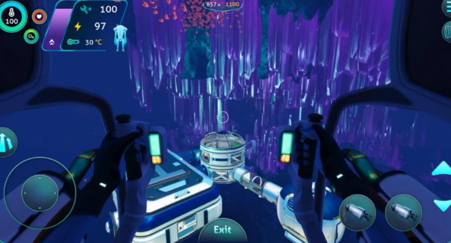 完成初期补给后,应依据PDA导航系统前往坠毁吊舱。该地点是游戏前期最核心的安全据点:内置工作台、氧气补给站,并可解锁大量基础蓝图,为后续建造与科技树拓展奠定基础。生存体系围绕三大机制展开:体温管理、氧气供给与移动效率。水下环境本身不直接降低体温,但低温区域持续接触会导致数值缓慢下降;建议早期制作防寒布料与简易防寒服,中后期需部署加热器并构建恒温基地。食用炽热的百合羹等热食可快速恢复体温。同时,氧气条为水下行动的生命线,任何远距离探索都必须提前规划供氧方案。