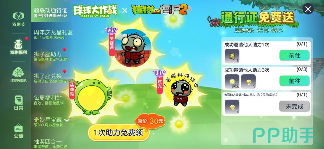 现在玩家只要注册体验球球大作战就有免费的联动通行证免费等你来领取哦,每天邀请好友为你进行助力还可以获得全皮的皮肤哦,就连我们在植物大战僵中万分熟悉的老朋友都会出现在球球大作战之中。