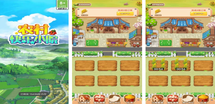 《农村快乐小院》采用的是传统的卡通画风,画面清新可爱的同时操作也相当简单,同样是一款自由度相当高的模拟经营类游戏。在这里你也可以自由选择植物种,随意扩大自己的农场。游戏没有太多的规则,却有相当多的奖励机制,每次完成订单或者活动任务后,都能获得丰富的金币或资源,可玩性非常高。