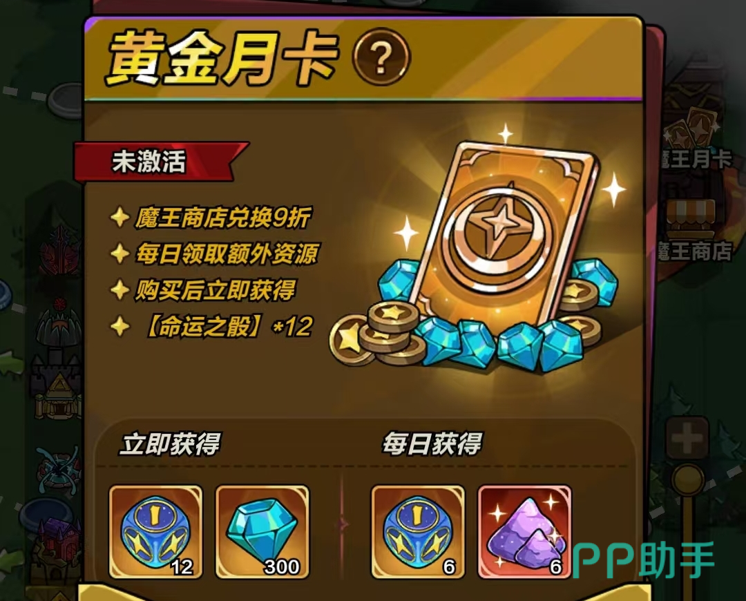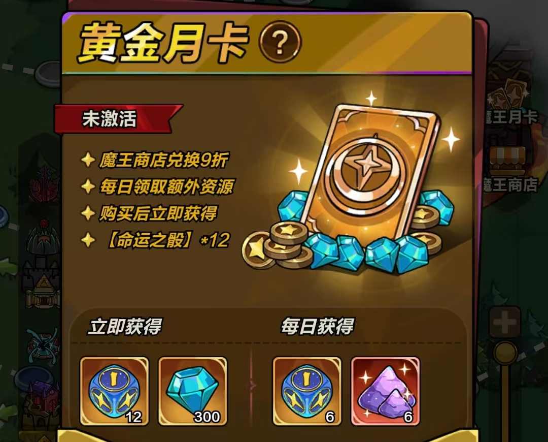 专为魔王城玩法设计,购卡即获12个【命运之骰】与300【钻石】;后续30天内每日额外获得6个【命运之骰】与6个【传说尘】;同时享受魔王商店9折优惠。【传说尘】可用于兑换魔王商店全部限定物品。