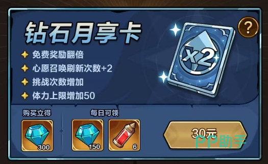 享有免费奖励翻倍、挑战次数上限提升、体力上限+50等成长加成;购卡即得300钻,每日还可领取150钻及6个【宝石洗炼道具】。