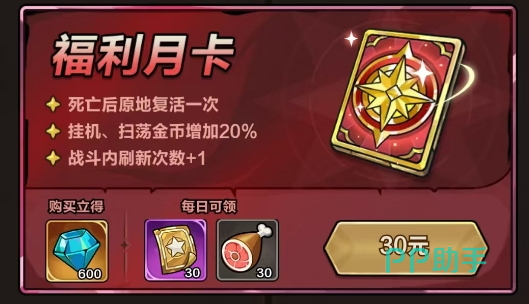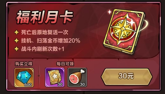 提供死亡原地复活1次、挂机扫荡金币+20%、战斗内刷新次数+1三项实用特权;购卡立得600钻,每日可领30张【召唤券】与30点【体力】。