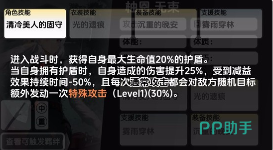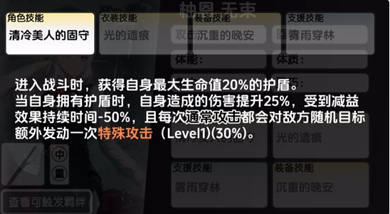 柚恩的核心定位并非传统爆发型副C,而是以“护盾即输出”为底层逻辑的功能型角色。其主动技能【清冷美人的固守】提供双重增益:入场时立即获得相当于自身最大生命值20%的初始护盾;护盾存在期间,角色全伤害提升25%,并降低所受减益效果50%。尤为关键的是,该技能使每次普通攻击均能额外触发一次对随机敌方目标的特殊伤害,彻底打破副C依赖元素爆发维持输出节奏的常规限制,实现真正意义上的常驻站场压制力。