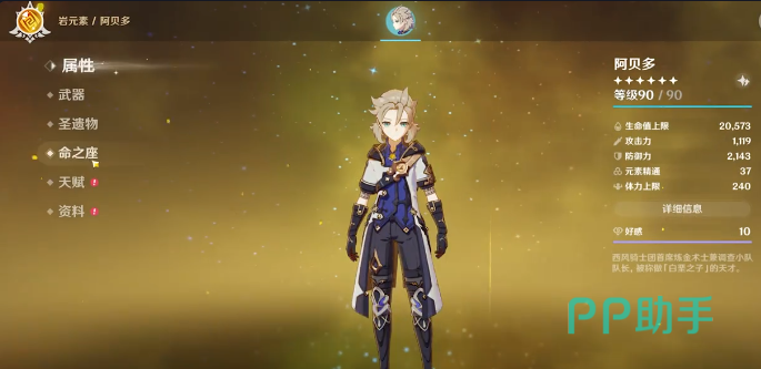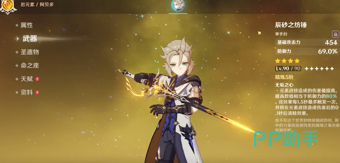 本次挑战中,阿贝多为零命状态,天赋等级配置为普通攻击二级、元素战技七级、元素爆发六级,属于偏重功能性的实用养成路线。武器推荐使用“千岩古剑”(即文中所指“纺锤”,为玩家常用昵称),契合其防御力转化为攻击力的核心机制。角色面板数据为:防御力2100点、充能效率130%、暴击率63%、暴击伤害133%。建议在圣遗物与副词条选择上适当堆叠充能属性,以保障元素战技与元素爆发在循环中无缝衔接,避免技能真空期。