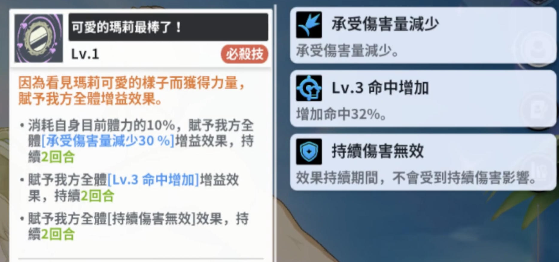 除了强化输出,葛修在生存保障方面同样表现出色。他的必杀技“可爱的玛丽是最棒的!”以自身部分生命值为代价,为全体队友施加伤害减免与命中率提升效果,并具备格挡持续伤害的能力,极大提升了脆皮角色在高压力战斗中的存活率。配合觉醒被动与专属被动机制,当技能释放成功或增益被清除时,还能触发生命恢复效果,进一步延长团队续航时间。