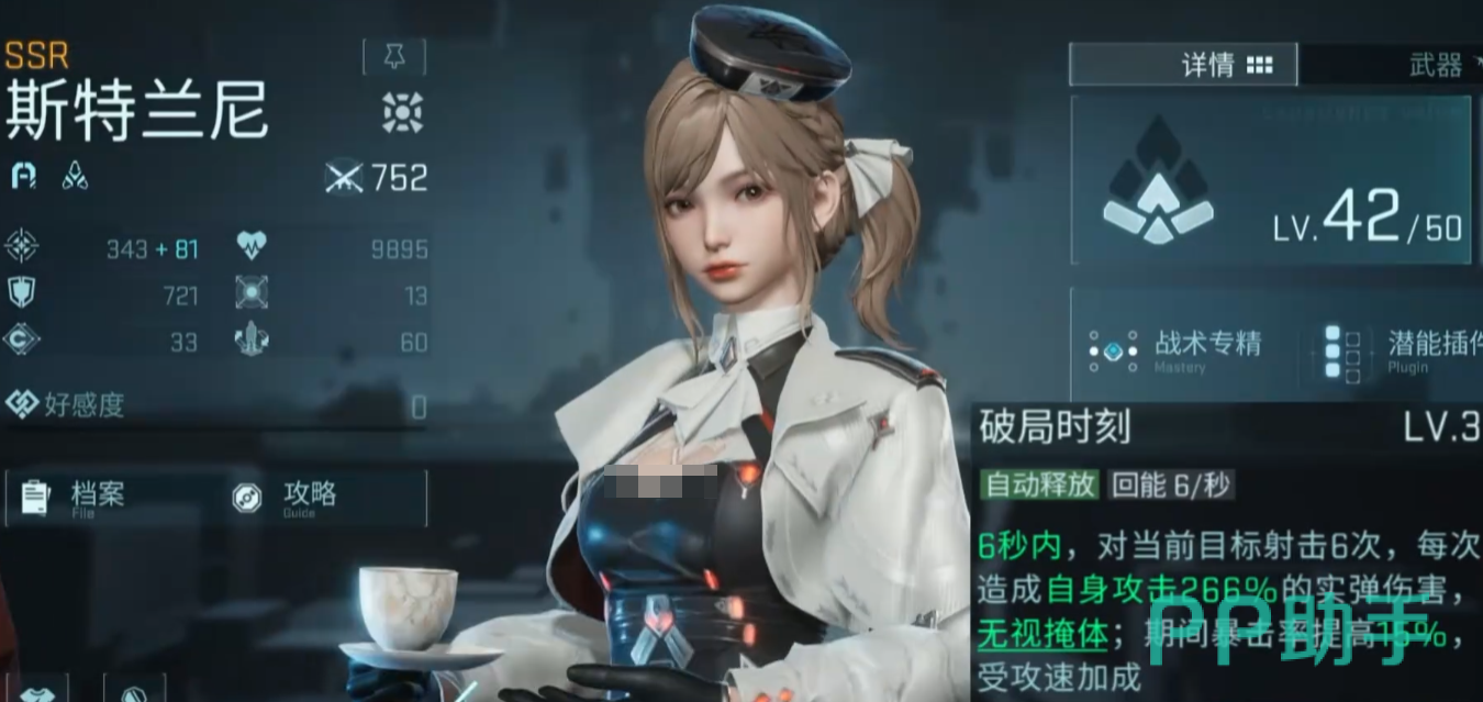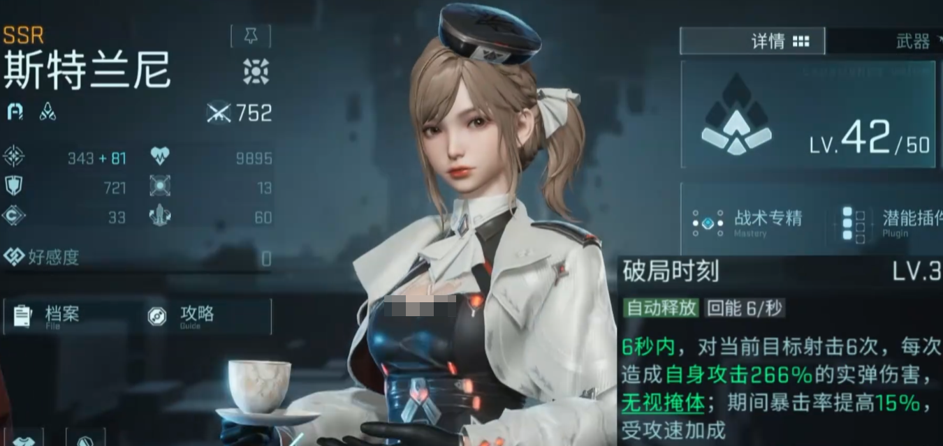 她的终极技“打压吸筹”可在射程范围内随机发动四次攻击,优先选择不同敌人,并每次造成等同于自身攻击力312%的电磁伤害。该技能具备无视掩体的特性,使其在复杂战场环境中依然能保持高效输出。初始大招能量仅为40点,释放频率较高,适合在需要多次循环施放技能的阵容结构中使用,快速打出成吨伤害。