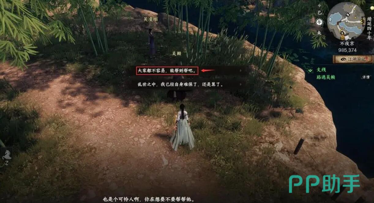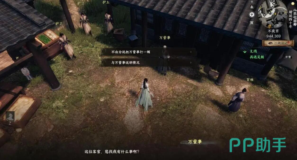 该任务触发点位于不夜京御者附近的坐标985.374处,玩家将在此遇见NPC吴赖。对话时必须选择首个选项才能激活任务流程,否则会导致任务无法继续推进。完成对话后,系统会引导玩家前往寻找万管事,在此阶段会出现战斗或和平两种处理方式,但无论选择哪一种,最终都需通过击败吴赖来达成任务目标。建议在接任务前手动保存进度,防止因战斗失败导致任务中断。