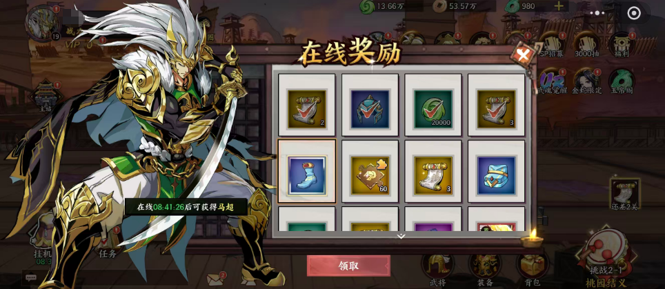 登录游戏后,界面右上角会显示“在线奖励”入口。该系统按累计在线时长发放资源,每日可稳定获取招募帖、铜钱、经验丹及蓝色品质装备(含头盔、靴子等)。这些蓝装虽非高阶配置,但完全适配前期武将过渡需求。值得注意的是,招募帖是后续抽卡的核心消耗道具,而在线奖励是其最主要来源之一。即便当日无法深度参与玩法,仅保持后台挂机,也能持续积累经验与资源。挂机收益随在线时长线性增长,所获经验量级可观,对副本参与度较低的玩家而言,这是可持续提升等级的重要途径。