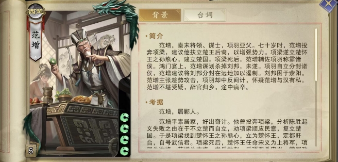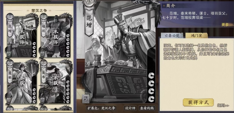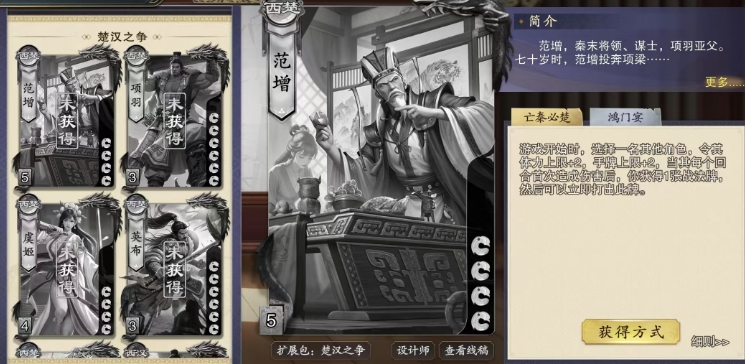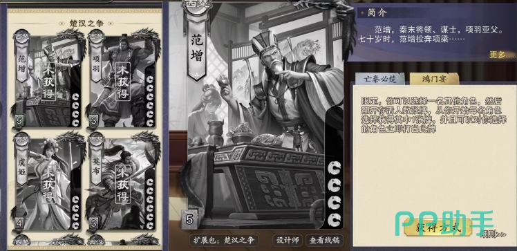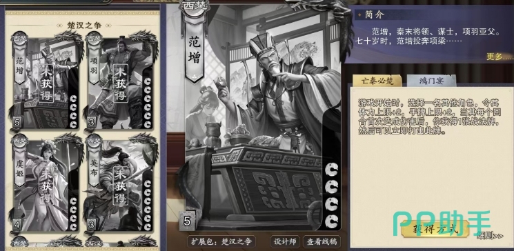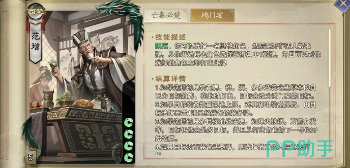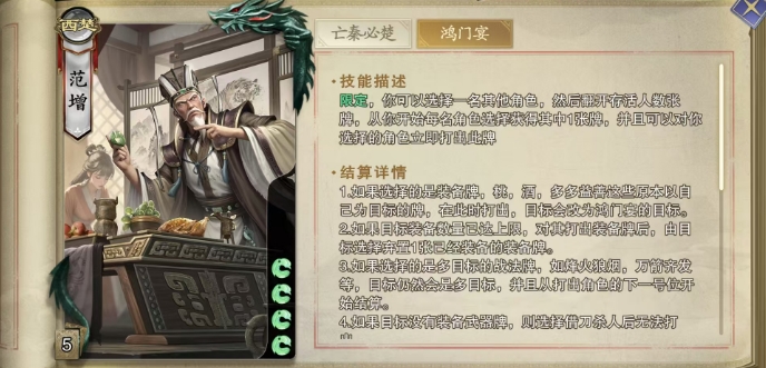 第二个技能鸿门宴,大家使用的时候能够选择一名其他角色成为这场盛宴的主角,随后翻开等同于当前存活人数的牌数,从范增开始,每名角色轮流选择并获得一张牌,而这仅仅是开始,因为范增还可以立即对获得牌的角色打出与此牌相同的牌,这是范增的一个限定技能,整局游戏中只能发动一次,因此使用时需要格外谨慎,这个技能的无论是用于破坏对手的手牌布局,还是为队友创造进攻机会,都能收到奇效。