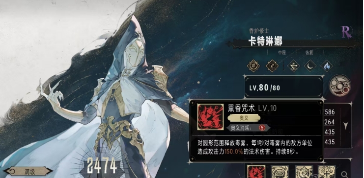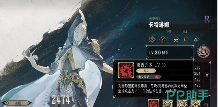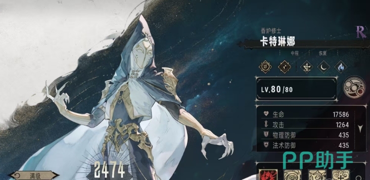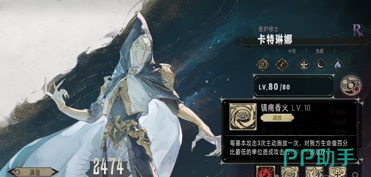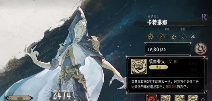 她的效果其实在于恢复,是一名辅助型人物,其月相设定为新月,卡特琳娜的技能上普通攻击焚香,在战斗中当她发动普通攻击时,可以对主目标造成 127%攻击力的法术伤害,这里的攻击力数值是根据她自身的属性以及可能存在的一些装备加成等因素综合计算得出的,这个技能伤害数值在R级角色中算是比较可观的,尤其是在游戏的前期或者一些相对简单的战斗中。