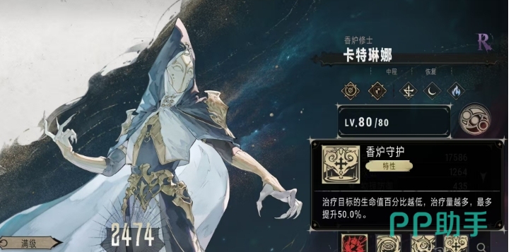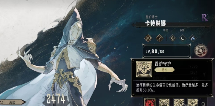 除了普通攻击,卡特琳娜还拥有一个极具特色的特性叫做香炉守护,这个特性的效果与治疗量密切相关,它的作用机制是治疗目标的生命值百分比越低,治疗量也就越多,最多可以提升到50%,这意味着在战斗中,当队友的生命值处于较低状态时,卡特琳娜对他们进行治疗时会获得额外的治疗加成效果,这个治疗效果不算强,但是在有输出技能可用的时候,这个角色还有一个治疗,那么本身角色能力就比较全面了。