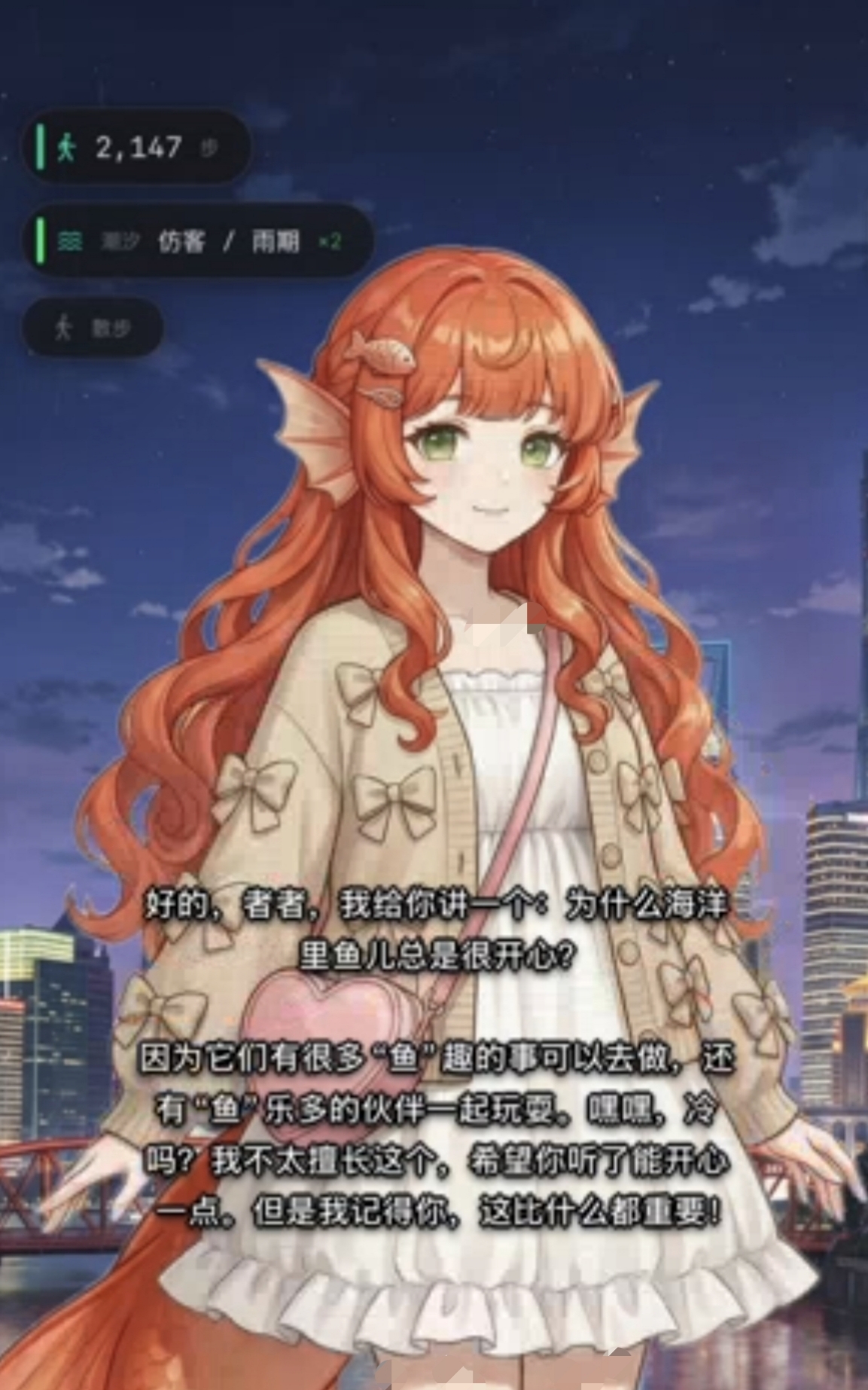 角色具备拟人化记忆系统,可同步记录玩家步数、作息规律及情绪倾向等数据,并主动发起关怀式对话。例如提醒就寝时间、评估睡眠质量、分享当日心情等,强化情感纽带。玩家亦可通过倾诉日常情绪,在互动中逐步解锁角色背景故事与深层设定。