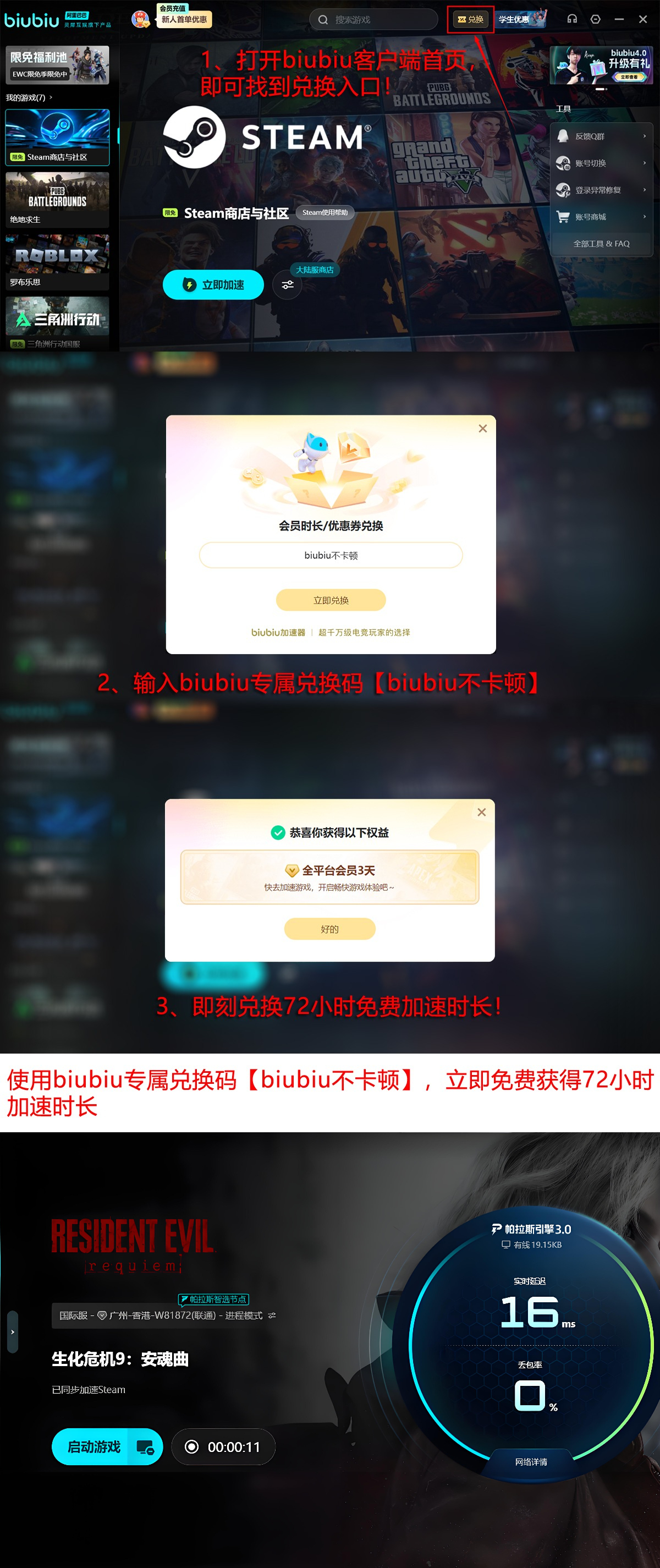 新用户注册biubiu加速器,首次登录即赠24小时免费加速时长;无论新老用户,输入兑换码【biubiu不卡顿】均可额外获得72小时,总计可享96小时无门槛加速服务。