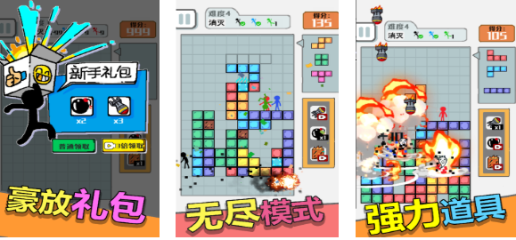 压倒火柴人也是款将俄罗斯方块跟火柴人IP结合的神作,具备着无尽模式和普通消除玩法等多样内容,形形色色的强大道具也可帮助大家快速压扁火柴人,超前的互动解谜设定和多样的礼包也是本作亮点,方格颜色绚丽多彩与火柴人的简单UI形成视觉待查,更有超解压的快节奏消除模式可以参与哟。
