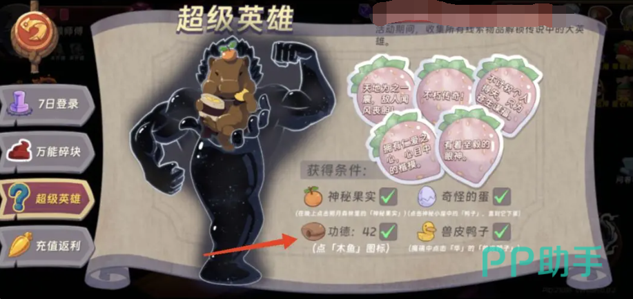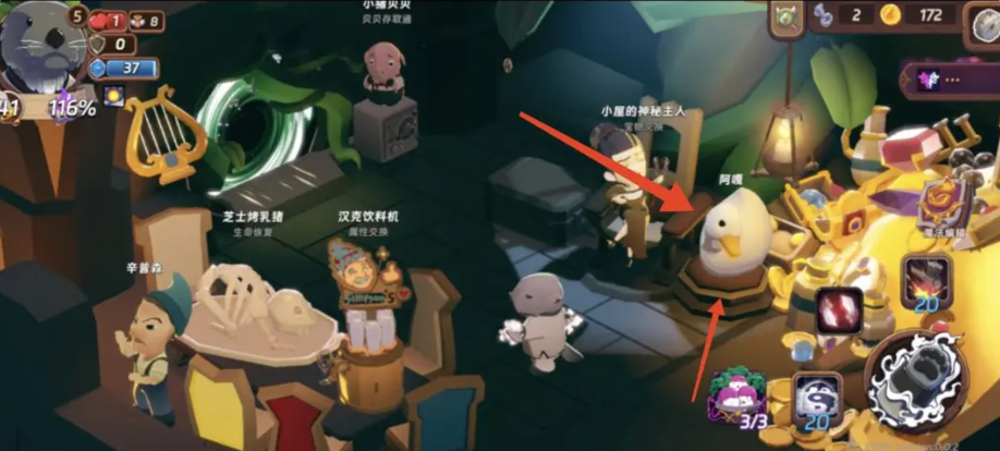 卡皮巴拉在游戏中被赋予“天才水豚”的称号,其解锁需依次收集四类关键道具:神秘果实、奇怪的蛋、功德木鱼、兽皮鸭子。第一步,前往大树守卫关卡,在不触发战斗的前提下,沿右侧枝杈行进至末端,拾取悬垂的神秘果实;第二步,需先击败当前区域Boss,进入休息阶段后,一名白色NPC将自动现身,与其对话即可获得奇怪的蛋;第三步,进入活动中心界面,定位木鱼图标并持续点击,当界面反馈明显震动且出现金色光标时,即表示功德木鱼已成功激活;第四步,打开魔镜图鉴,选定指定角色并播放其出场动画,待鸭子形象浮现后,连续点击三次,即可完成兽皮鸭子收集。集齐全部四件道具后,将自动触发卡皮巴拉专属剧情任务,完成后即可正式获得该角色。