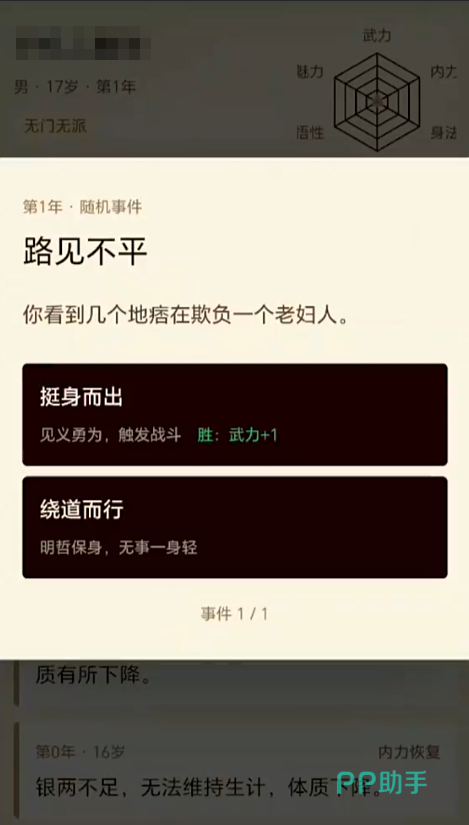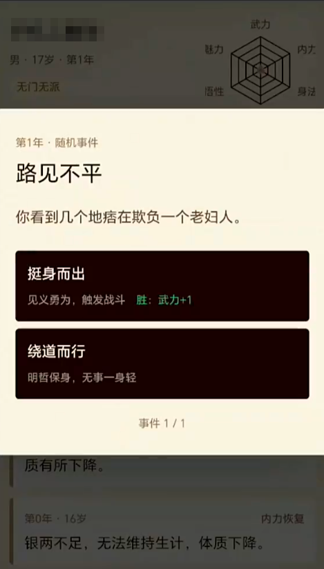 属性设定完成后,系统将自动推进剧情发展。途中会随机触发各类江湖事件:例如路遇恶徒欺凌老者,玩家可选择挺身制止、悄然回避或借势周旋。若选择出手,将即时进入回合制战斗,胜利后获得经验、银两及特殊道具奖励;失败则可能负伤、结仇甚至改变人生轨迹。每次决策均实时影响角色声望、门派关系与隐藏结局解锁条件。