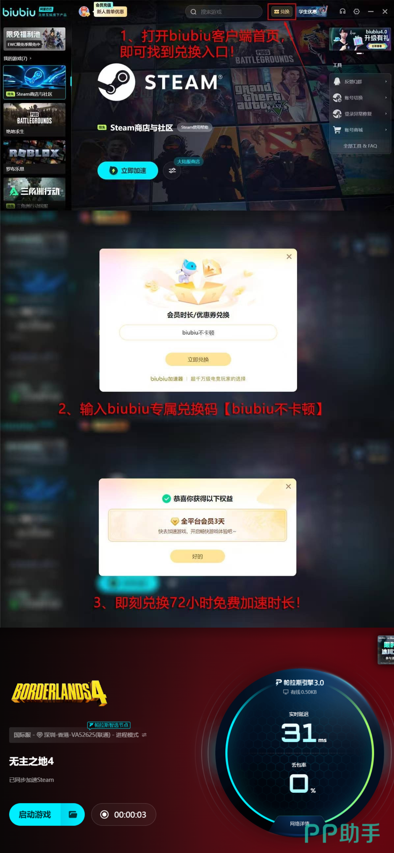 值得一提的是,该服务平台不仅支持多款热门游戏加速,还为新用户提供专属福利。注册后即可立即领取24小时免费试用时长,所有用户还可通过输入【biubiu不卡顿】额外获得3天加速服务,此优惠限领取一次,助力玩家零成本体验高效连接。