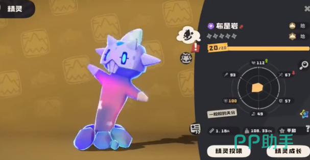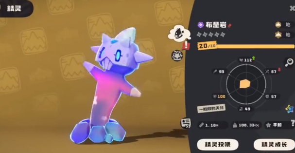 布是岩初始形态为布是石,头上还会有绚丽的宝石,在这个时候战斗力还是比较差的,只有73。魔法抗击能力还有魔法攻击也比较弱,不过在满足特定条件之后,一旦完成进化就可以迅速的提升整体的实力。