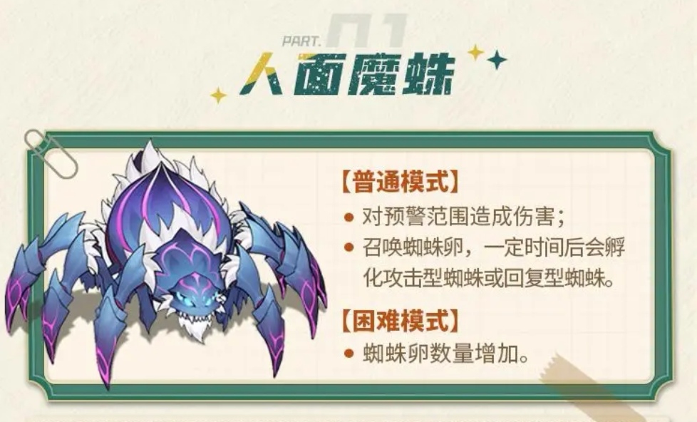 首位登场的是人面魔蛛。普通难度下,该Boss会释放扇形预警区域造成范围伤害,并周期性生成蜘蛛卵;卵体将在固定时间后孵化为攻击型或治疗型蜘蛛。困难难度则显著提升卵的数量与孵化频率。实战建议:优先清理未孵化的蜘蛛卵,规避其预警红圈,避免被多只功能性蜘蛛围攻导致战局失控。