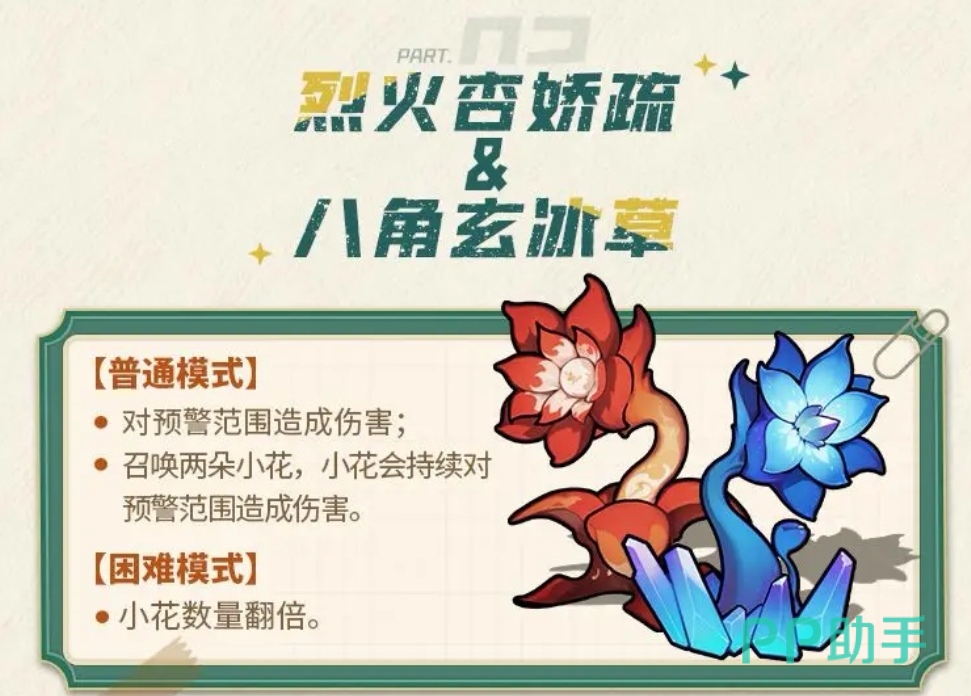 第六位是烈火杏娇疏&八角玄冰草双生Boss。普通难度下,二者联合发动矩形预警打击,并召唤两朵具备自主索敌与普攻能力的小花;困难难度中小花数量增至四朵。打法逻辑清晰:规避双Boss本体技能前摇,集中火力优先摧毁小花单位,大幅压缩其整体输出压力。