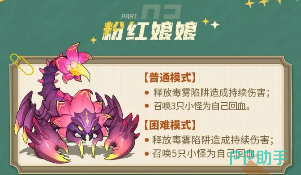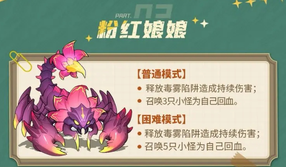 第三位为粉红娘娘。其普通难度技能组合包含持续毒雾陷阱(造成DOT伤害)及召唤3只辅助小怪为其恢复生命值;困难难度下,毒雾持续时间不变,但小怪数量增至5只。打法关键点在于:在毒雾生效间隙快速清剿全部小怪,阻断其回血链路,避免Boss因持续续航拉长战斗时长。