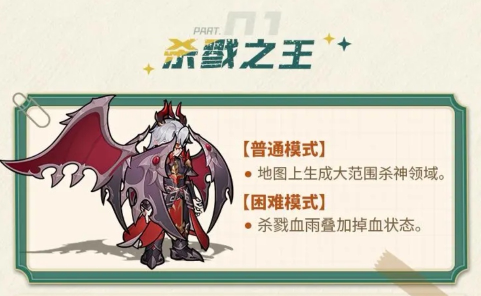 第五位为杀戮之王。普通难度开启大范围“杀神领域”,区域内持续扣减角色生命;困难难度叠加“杀戮血雨”状态,使角色在领域内额外承受每秒递增的流血伤害。应对方式需严格把控安全站位——始终维持在领域覆盖范围之外进行远程压制;困难模式建议编队中配置具备稳定治疗能力的职业角色以维持生存阈值。
