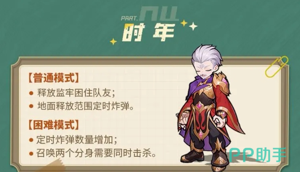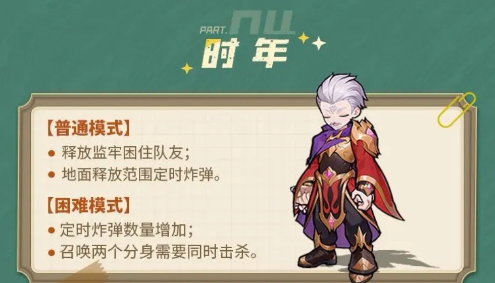 第四位Boss是时年。普通难度下,他可施放单体禁锢牢狱控制我方角色,并在地面布置多颗延时引爆的范围炸弹;困难难度新增两具分身,分身具备独立行动能力且能强化本体输出。推荐策略:第一时间解除队友禁锢状态,优先处理分身至残血再协同集火本体,实现高效减员。